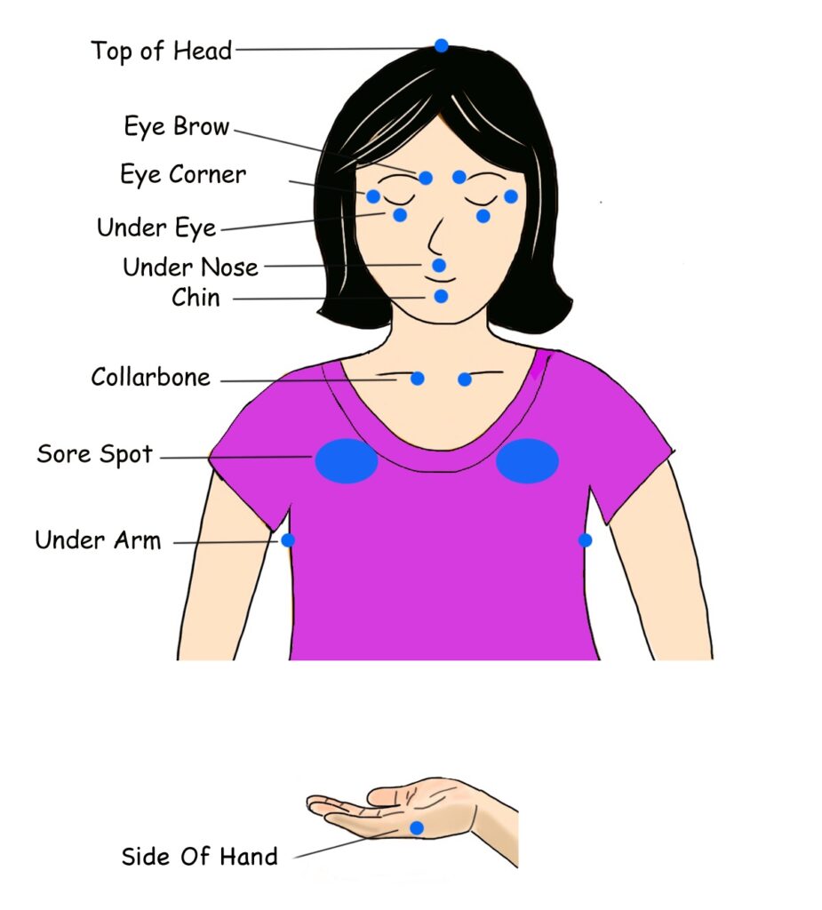 Collarbone (CB) – This point is under the u-shaped notch at the top of the breastbone. Move down about an inch and then go over an inch or two. Use two or more fingers to tap with either hand.